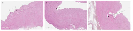 (A) Grade I lesion-focal edema (arrows) of the inner third of the media and extending to a depth of up to 10% of the thickness of the media, ×50. (B) Grade II lesion-focal necrosis of the intima and the inner third of the media (arrow) and depth up to 10% of the thickness of the media layer, ×50. (C) Grade III lesion-dissection of the artery wall with a depth of more to 50% of the media thickness (arrow) and hemorrhages at any depth of the media, in the adventitia and adipose tissue (with a diameter more than 800 µm), ×50.
