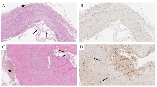(A) A section of the pulmonary artery with dissection and hemorrhage (an arrow-intima with necrosis, a star adventitia), ×100 (Sheep №1). (B) A similar section area with S100 immunolabeling, ×100 (Sheep №1). (C) Dissection of the pulmonary artery trunk, fibrin thrombus at the site of dissection (arrow), hemorrhage in the adventitia (shown by a star), ×100 (Sheep №2). (D) A similar section site with preserved S100 expression on nerve fibers (arrow) in media close to the dissection area, S100, ×100 (Sheep №2).