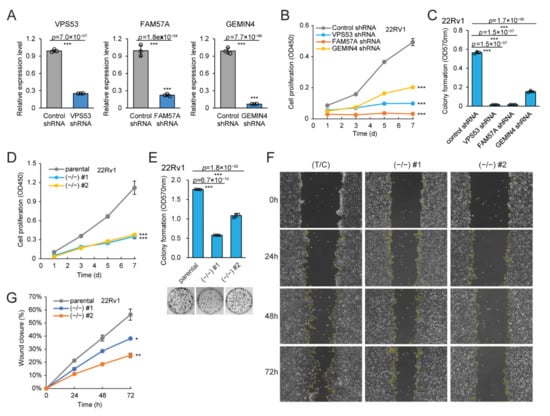 2.7. VPS53, FAM57A, and GEMIN4 Knockdown Impedes Cancerous Phenotypes