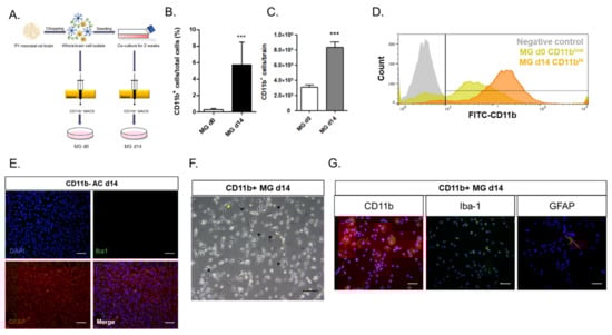 CD11b−/GFAP+ astrocyte from whole brain culture induced microglial proliferation and activation: (A) the experimental scheme of microglial isolation by MACS. Day 0 microglia were isolated immediately from whole brain cell isolates by CD11b+ MACS, and Day 14 microglia were isolated from the 2-week mixed glial cell culture; (B) the CD11b+ cell yield of MG d0 and MG d14 (n = 11); (C) the numbers of CD11b+ cells per brain for MG d0 and MG d14 (n = 11); (D) flow cytometry analysis of MG d0 and MG d14 with the microglia-specific marker CD11b. Fluorescent intensity of CD11b was enhanced in MG d14 compared to that of MG d0; (E) fluorescence images for CD11b− cells sorted from the 2-week mixed glial cell culture stained for microglia-specific marker iba-1 and astrocyte-specific marker GFAP; (F) bright field image of MG d14. Yellow arrowhead: ramified microglia; black arrowhead: bipolar-shape microglia; white arrow: round-shape microglia; (G) fluorescence images of MG d14 stained with microglia-specific markers CD11b and iba-1 and astrocyte-specific marker GFAP. *** p < 0.001; scale bar = 100 μm.