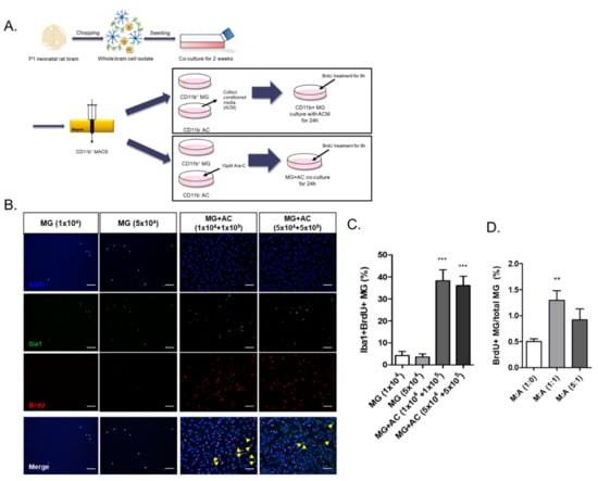 Astrocytes directly increased microglial proliferation: (A) the experimental scheme of microglial co-culture with astrocytes and treatment of ACM; (B) the BrdU-incorporation assay for the MG d14 co-cultured with astrocytes. Yellow arrowhead: Iba-1+BrdU+ cells; (C) the quantitative data of the percentage of BrdU+ cells under co-culture of astrocytes (n = 5); (D) quantitative data of the percentage of BrdU+ cells under treatment of ACM to MG d14 (n = 5). ** p < 0.01, *** p < 0.001, n = 3; scale bar = 100 μm.