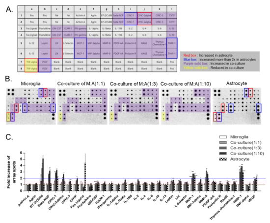 The secretome analysis of single or co-culture of microglia and astrocytes with rat cytokine array: (A) cytokine array map. The array can detect 34 soluble mediators. Pos: positive control; Ne: negative control. (B) The cytokine arrays were performed with conditioned medium of microglia, astrocyte single culture, or microglia–astrocyte co-culture in various ratios. (C) The quantitative data of the fold increase in array spots between microglia, astrocyte single culture, and microglia–astrocyte co-culture. Red line: 1x baseline of array spots; Blue line: 2x baseline of array spots. * p < 0.05, ** p < 0.01, and *** p < 0.001.