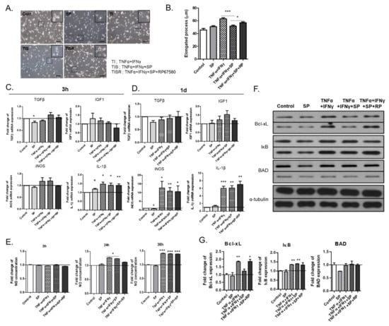 It was explored whether M2 microglia in the mixed glia culture could be further converted to the M1 phenotype upon exposure to pro-inflammatory cytokines, such as TNF-α and IFN-γ, which can also be modulated by the co-existence of the neuropeptide SP, also known as M2 cytokine []. TNF-α and IFN-γ altered the morphology of primary microglia from a round amoeboid and short bipolar morphology to the bipolar morphology with an elongated process (Figure 5A,B). SP itself did not significantly alter the morphological change but partially inhibited the TNF-α- and IFN-γ-mediated process elongation, which was nullified by co-treatment with the NK-1 receptor antagonist RP67580. To define the phenotype of TNF-α- and IFN-γ-activated microglia, qPCRs of TGF-β and IGF1 for M2 microglia and iNOS and IL-1β for Μ1 microglia were performed (Figure 5C,D). TNF-α and IFN-γ did not affect the expression of TGF-β and IGF1 significantly but markedly increased the expression of iNOS and IL-1β at one day post-treatment. Along with iNOS induction, elevated NO production was observed in TNF-α- and IFN-γ-treated microglia (Figure 5E). Accordingly, TNF-α- and IFN-γ-activated microglia exhibited an M1 phenotype. Furthermore, TNF-α and IFN-γ increased Bcl-xL expression, which was inhibited by SP co-treatment (Figure 5F,G). The microglia in the mixed glial culture skewed the M2 phenotype, which could be further polarized to the M1 phenotype upon the exposure to the pro-inflammatory cytokines TNF-α and IFN-γ.