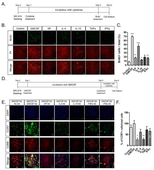The MG d14 were incubated with the following cytokines for 5 days: 10 ng/mL GMCSF (R&D systems, Minneapolis, MN, USA), 100 nM SP (Sigma, St. Louis, MO, USA), 10 ng/mL rat IL-4 (R&D systems, Minneapolis, MN, USA), 10 ng/mL rat IL-10 (R&D systems, Minneapolis, MN, USA), 10 ng/mL TNF-α (Sigma, St. Louis, MO, USA), and 20 ng/mL IFN-γ (R&D systems, Minneapolis, MN, USA). 20 μM of BrdU were added 24 h before cell fixation. The staining procedure was the same as described above.