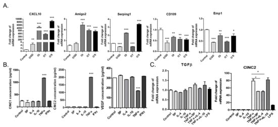 Then, the modulation of A1/A2 phenotype by pro-inflammatory or anti-inflammatory cytokines was determined (Figure 7B,C). TNF-α markedly increased CINC-1 and CINC-2, which are major cytokines in astrocytes, but not VEGF, based on an ELISA and CINC-2 gene expression analysis via real-time PCR analysis. Anti-inflammatory cytokines, such as IL-4, IL-10, and SP, did not affect CINC 1/2 expression, and none of the cytokines affected TGF-β expression.