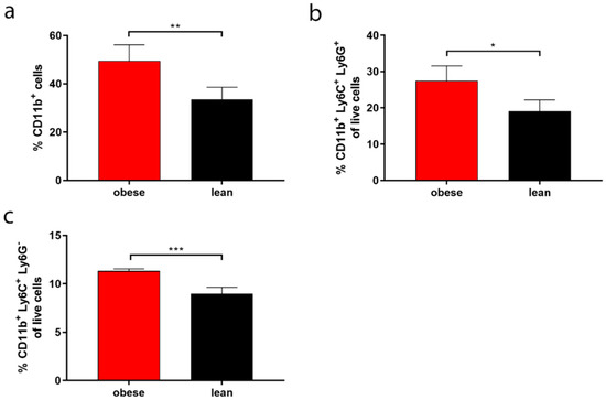 Obese mice had elevated levels of myeloid cells in the bone marrow as compared with lean mice. Bone marrow cells were isolated from obese and lean mice and analysed for the frequency of (a) CD11b+ cells; (b) CD11b+ Ly6C+ Ly6G+ cells (inflammatory monocytes) and (c) CD11b+ Ly6C+ Ly6G− cells (neutrophils) by flow cytometry. Frequencies are shown as a percentage of live cells. Data are the mean + STD from four independent repeats, with 1 female mouse/repeat. Unpaired student’s t-test: *** p < 0.001, ** p < 0.05, * p < 0.01.