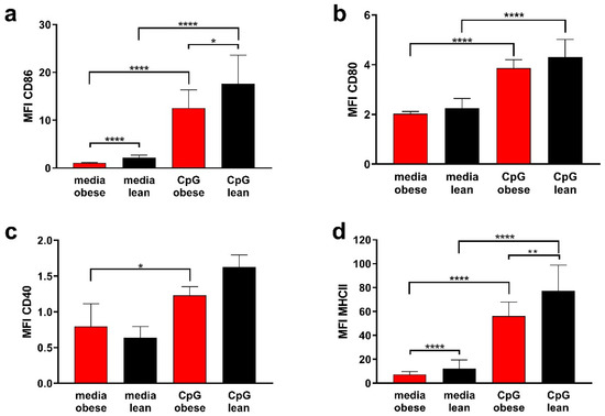 CpG stimulation led to significantly increased CD86 and MCHII expression levels in both lean and obese mice (Figure 2a,d). BMDCs from lean mice expressed significantly higher levels of CD86 and MHCII both in the un-stimulated state as well as following CpG stimulation, compared to BMDCs from obese mice.