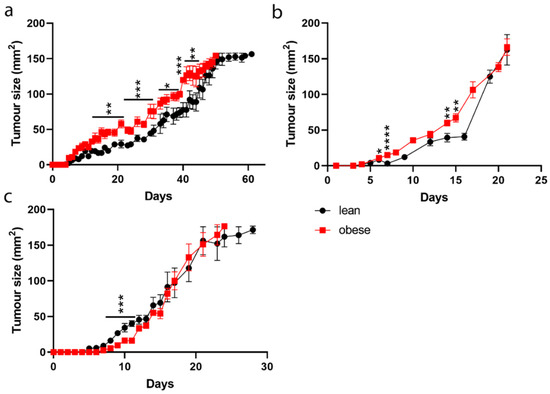 Three different tumour cell lines were implanted into either lean or obese mice and their growth kinetics were observed. Non-metastatic BC from C57mg cells and metastatic BC from EO771.LMB cells were implanted percutaneously into the 3rd mammary fat while MC38 CRC cells were injected subcutaneously into the right flank. While there was no overall significant difference in tumour growth rate for any of the models, both the non-metastatic and metastatic BC showed prolong difference in the tumour size up until the tumours reached approximately 140 mm2. In both BC models the tumours grew faster in obese mice compared to lean mice (Figure 3a,b). In the CRC model, tumours grew faster in lean mice up to 50 mm2, with no difference in tumour size after that (Figure 3c).