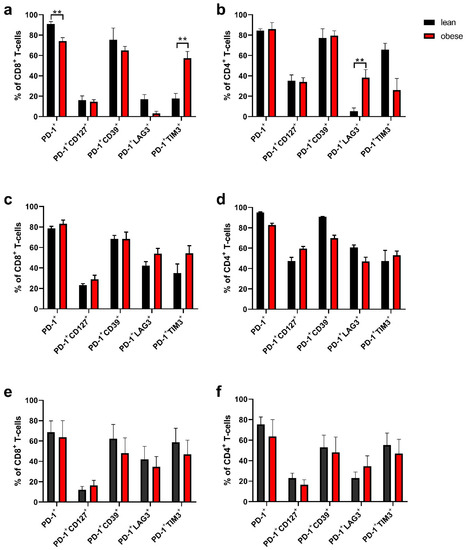 T cells which are terminally exhausted, express PD-1 as well as Tim-3 or LAG-3. A significantly higher frequency of CD8+PD1+TIM3+, as well as CD4+PD1+ LAG3+ were found in cells from obese versus lean mice in the non-metastatic BC model (Figure 4a,b). No other differences in cells from obese and lean mice were observed in any of the tumour models.
