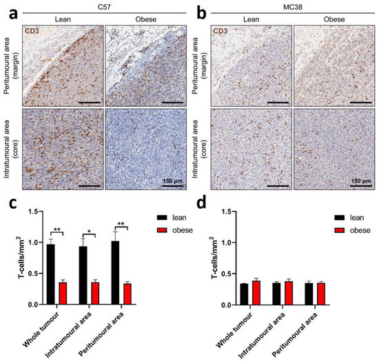 Apart from analysing the phenotype of exhausted TILs in the tumour models in lean and obese mice, we also investigated the infiltration frequency and spatial distribution of the TILs. Once tumours reached 150 mm2, they were extracted from the mice, formalin-fixed paraffin-embedded (FFPE), sectioned and stained for CD3 by immunohistochemistry. Slides were analysed for T-cell density in the whole tumour, intra- and peritumoural areas.