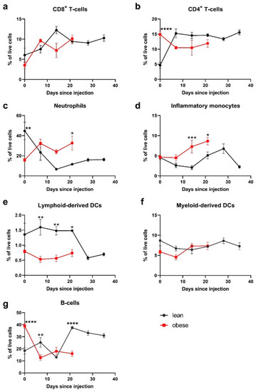 Differences in several cell populations were detected in lean and obese mice at differing time points. While the frequency of CD8+ T cells increased in both mouse types from baseline up to fourteen days post tumour cell grafting and remained steady at ~10% of live cells after this, no statistically significant differences were seen between the mouse types (Figure 6a).