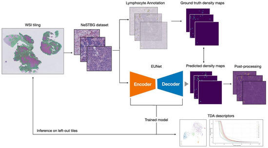 Graphical representation of the full analysis workflow. From the original WSIs, the collection of tiles constituting the NeSTBG dataset is generated and annotated to obtain the ground truth for the model (Section 4.1). Tiles are then used as the input for the DL architecture EUNet (Section 4.2 and Section 4.3) to predict density maps (Section 4.4), that are then post-processed and analysed via TDA descriptors to interpret the detected deep features (Section 4.5).