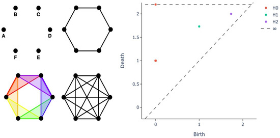 - The second complex () includes 6 0-simplices and 6 1-simplices, denoted by dots and lines, respectively. Here and as there is one connected component and one 1-dimensional hole, namely the circle originated by the connection of the points.