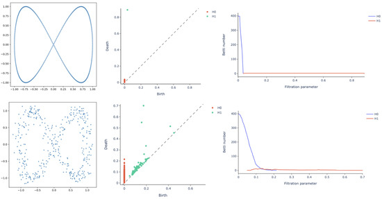 Topological descriptors on a lemniscate-shaped synthetic dataset with (top) and without (bottom) noise: dataset scatterplot (left column), persistence diagram (central column) and Betti curves for homology groups and (right column). Although it is still possible to appreciate the same topological structure, the persistence diagram for the noisy lemniscate has a cluster of points near the diagonal, representing non-persistent features of the input point cloud. The different spatial organization of the two structures is also reflected by the Betti curve for , displaying a slower decay rate.