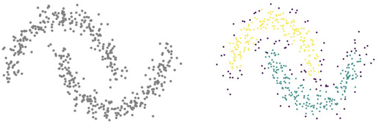 Hierarchical density-based spatial clustering of applications with noise (HDBSCAN) [93] is an extension of the classic DBSCAN algorithm [94], improved by providing a hierarchical structure of clusters found from density estimation and a more intuitive approach for cluster selection. The density-based approach can identify clusters with arbitrary shapes, thus overcoming limitations of algorithms that are able to work only with convex clusters such as K-means. An example of HDBSCAN applied to arbitrarily shaped clusters in is shown in Figure 4.