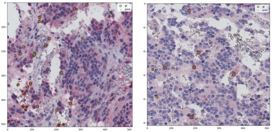 Examples of lymphocytes detection obtained through postprocessing of predicted density maps on the original tiles of Figure 5. gt: ground truth after postprocessing, pred: prediction.