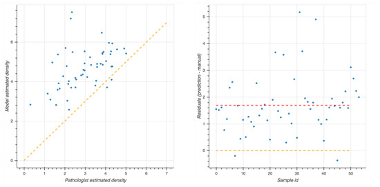 where n is the number of regions of interest (5 or 10), log is the natural logarithm, is the number of lymphocytes in the i-th selected region of interest, and is the area of the i-th region of interest expressed in mm. The two density estimates have a Pearson correlation coefficient of 0.47 with p-value : in detail, in Figure 7 the corresponding correlation plot is shown, together with the residual plot displaying the difference between DL-predicted density value and pathologist estimation, indicating a positive offset.