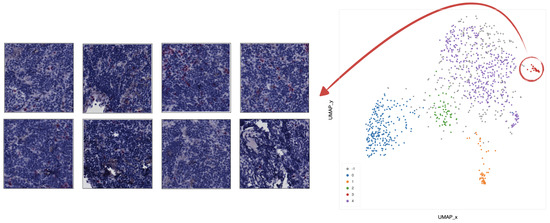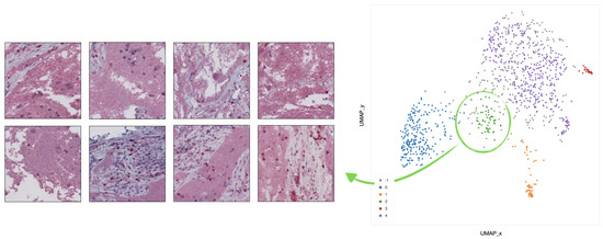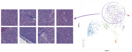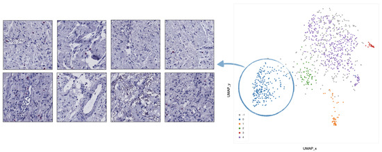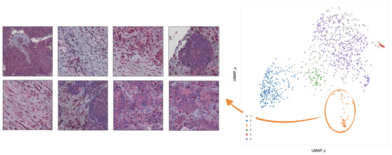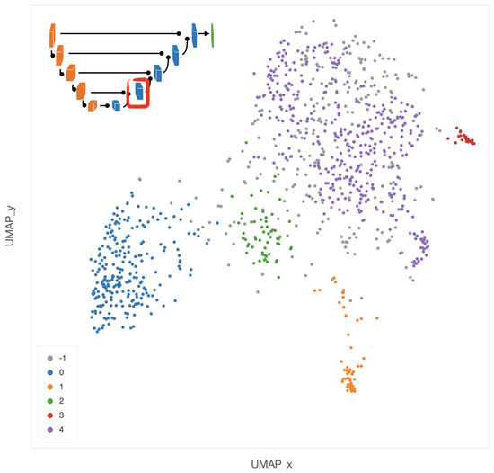 Clustering analysis was performed by HDBSCAN on the deep features projected by UMAP from the deepest (central) layers of the EUNet. Notably, these features are represented by vectors , with dimension D = 524,288, as the output of the feature maps in the deepest layers has spatial dimensions and 64 feature channels. The most interesting structure emerged in the second block of the EUNet decoder; Figure 8 shows the cluster assignment using cosine similarity as metric in the higher dimensional space, 15 neighbours and zero minimum distance for UMAP, minimum cluster size 5 and minimum number of samples 16 for HDBSCAN.