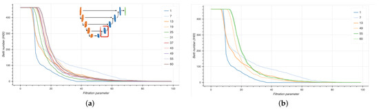 Betti numbers can be encoded into a two-dimensional scatterplot, each point representing a specific topological feature of the dataset. The x and y coordinates denote the values of the distance for which topological features appear (“birth” x) and vanish (“death” y), respectively. Considering as coordinates of the scatterplot, only half of the plot is relevant and, the closer a point is to the diagonal, the shorter its lifetime, and thus the point may represent topological noise. The k-th Betti number is the rank of the k-th homology group and thus each feature counted by belongs to . Considering now the plot in Figure 2: