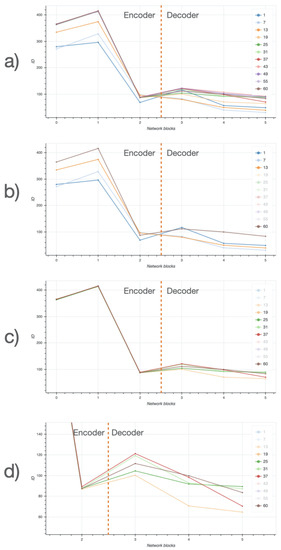 Detailed dynamics of the ID estimates are reported in Figure 18. In the top panel, the ID is plotted for each inner block for all the training epochs. In (panel b), ID is plotted for the first three epochs (1,7,13) and for the last epoch (60), which corresponds to the highest peak of the encoder. During the central epochs (panel c) ID values of the encoder are stable, while the ID values of the decoder still show some variability; in particular (panel d) a ID peak on the third block. Thus, ID dynamics share a similar trend in both the encoding and the decoding phase, at different magnitudes.