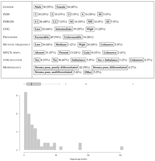 Summary of clinical features and age distribution at diagnosis (month) for the 54 patients of the NeSTBG dataset.