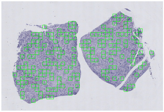 To address the above issues, a sequence of filters were applied to mask out low frequency areas, and morphological operations were used to refine the result. The extraction scheme was designed by overlaying a grid on the tissue area detected on each slide, where each cell of the grid represented a tile. A random number of tiles ranging from 20 to 175 were extracted with random uniform probability, in order to have a representative sample of tissue per slide. The pre-processing steps have been performed with the histolab library (https://github.com/histolab/histolab) (accessed on 13 August 2021), a recently introduced open source Python package for reproducible preprocessing in DP. An example of the tile extraction procedure is shown in Figure 20.
