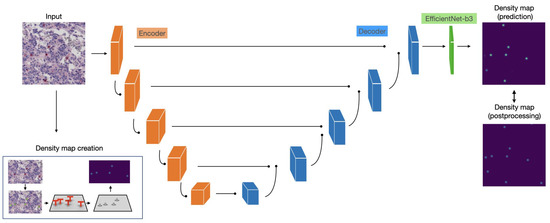 As pointed out in several references [36,37], detecting and quantifying lymphocytes represent a powerful tool to identify strong prognostic and predictive biomarkers for evaluating cancer progression and targeting novel therapeutic solutions. Nonetheless, it is widely acknowledged that the technical challenges to be solved towards the goal are numerous and difficult, making the aforementioned tasks very difficult to tackle and indeed still an open problem. No shared consensus has been reached by the community on an optimal methodology: automatic localization and quantification of lymphocytes have represented a major goal in DP in the last decade, resulting in a constant stream of publications, featuring the emerging solutions in both imaging and learning, together with dedicated reviews detailing such evolution [38]. Focusing on the methods adopting DL algorithms, convolution is the natural tool common to many proposals, starting from [39], where CNNs were combined with a probability map to identify lymphocytes’ centers. Other approaches have employed CNNs as a classifier to discriminate lymphocytes from the image background [40], generating a heatmap, representing the probability of each pixel being a lymphocyte. The strategy to move from the heatmap to the lymphocytes identification was later improved in [41] through thresholding, while clinical relevance was made explicit by detecting local spatial features [42]. Further technical improvements on the same directions were achieved in [43] with the development of a non-maxima suppression (NMS) algorithm to locate the center of each lymphocyte. Finally, the combination with a more classical morphologically oriented procedure [44] allowed Li and coauthors [45] to better identify the center of each candidate cell.