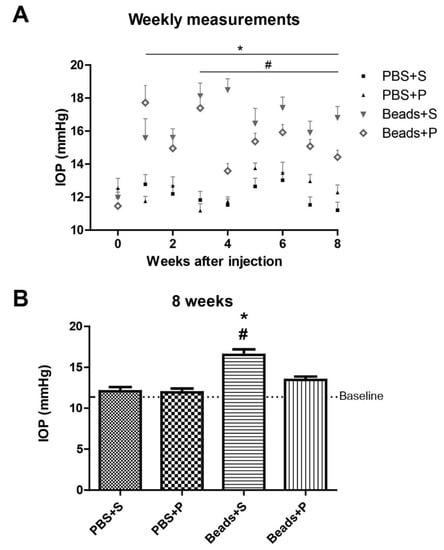 (A). IOP dynamics in the four examined groups (PBS + S, PBS + P, Beads + S, Beads + P) during the 8-week period. Intraocularly injected microbeads caused significant elevation of the IOP. (B). Bar chart shows the IOP in mmHg 8 weeks after the injection. Significant elevation of IOP was found in the Beads + S group compared to the control ones. PACAP1-38 eye drops resulted in the reduction of the IOP in the Beads + P group compared to the vehicle-injected group (Beads + S). Values are expressed in mean + SEM, analyzed by ANOVA and Bonferroni’s post hoc test. * Beads + S vs. PBS + S p < 0.05; # Beads + S vs. Beads + P p < 0.05. (Abbreviations: IOP: intraocular pressure; PBS: phosphate-buffered saline; S: Systane; P: PACAP1-38).