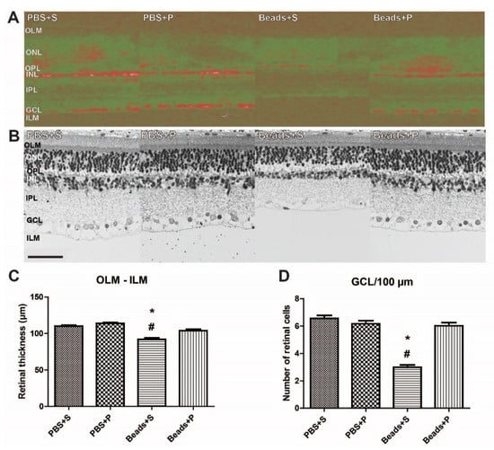 (A) Optical coherence tomography (OCT) shows the retinal layers in the four examined groups (PBS + S, PBS + P, Beads + S, Beads + P). In the OCT, retinal structure showed severe degeneration in the Beads + S group compared to the controls. A significant amelioration of the retinal structure was found after PACAP1-38 administration (Beads + P). (B) Representative light microphotographs of retinal sections in all groups. Retinal tissue from Beads + S group showed severe degeneration compared to PBS-injected retinas. The retained retinal structure following PACAP1-38 treatment (Beads + P) was similar to the control (PBS + P) retina. (C,D) Morphometric analysis of microbead-induced retinal damage. The degree of microbead-induced retinal neuronal degeneration and the neuroprotective effects of PACAP1-38 eye drops treatment were quantified by the cross-section of the retina from the outer limiting membrane to the inner limiting membrane (OLM–ILM), and the number of cells/100 µm ganglion cell layer (GCL) length. Values are expressed in mean ± SEM, analyzed by ANOVA and Fisher’s post hoc test. * Beads + S vs. PBS + S p < 0.05; # Beads + S vs. Beads + P p < 0.05. Bar: 50 µm. (Abbreviations: PBS: phosphate-buffered saline; S: Systane; P: PACAP1-38).