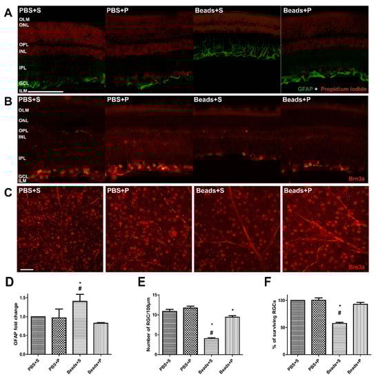 Representative vertical retinal sections (A,B) and whole-mount (retinal areas within 2 mm from the optic nerve) (C) stained by GFAP (A) and Brn3a (B,C) antibodies showing the effects of elevated IOP in the four examined groups (PBS + S, PBS + P, Beads + S, Beads + P). IOP resulted in massive elevation of GFAP immunopositivity (D), and reduction of Brn3a expression (E,F) in Beads + S group compared to the controls (PBS + S, PBS + P) and the PACAP1-38-treated (Beads + P) retinas. Statistical comparisons were made using ANOVA followed by Fischer’s (GFAP, Brn3a whole-mount) and Bonferroni’s (Brn3a section) post hoc analysis. Data are presented as means ± SEM. * Beads + S vs. PBS + S and Beads + P vs. PBS + P p < 0.05; # Beads + S vs. Beads + P p < 0.05. Bar: A, B: 50 µm; C: 100 µm. (Abbreviations: IOP: intraocular pressure; PBS: phosphate-buffered saline; S: Systane; P: PACAP1-38; GFAP: glial fibrillary acidic protein; Brn3a: brain-specific homeobox/POU domain protein 3A).