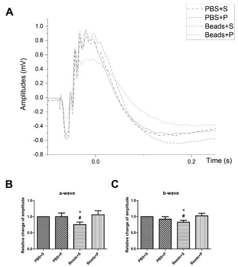 (A) Representative average ERG recordings of PBS + S, PBS + P, Beads + S, Beads + P groups. (B,C). Comparative analysis of the amplitude ratio of a-wave (B) and b-wave (C). ERG responses were similar in PBS + S and PBS + P rats under healthy conditions. Microbead-induced alterations (Beads + S) in the amplitudes of a- and b-waves compared to the control animals (PBS + S). ERG showed significant functional protection after PACAP1-38 eye drops treatment (Beads + P) in the microbead-injected eye compared to the Beads + S group. Data are given as mean ± SEM, analyzed by ANOVA and Fisher’s post hoc test. * Beads + S vs. PBS + S p < 0.05; # Beads + S vs. Beads + P p < 0.05. (Abbreviations: ERG: electroretinography; PBS: phosphate-buffered saline; S: Systane; P: PACAP1-38).