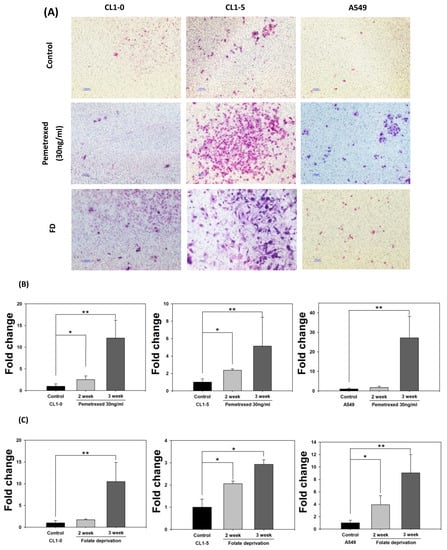 To further examine the effect of cytosolic folate disruption on EMT transformation in NSCLC cells, we analyzed NSCLC cell invasiveness. The cells were cultured under FD or treated with pemetrexed. The invasiveness of NSCLC after 2–3 weeks of treatment was measure by the Matrigel method (Figure 2A). Compared with the relatively normal culture control cells, at the end of the 3-week pemetrexed treatment, these cell lines exhibited magnitudes of migration ability changes (expressed as folds) of 12.1 ± 4.1 (CL1-0), 5.2 ± 3.3 (CL1-5), and 27.2 ± 11.0 (A549) (Figure 2B). Consistent results were obtained for all three NSCLC cell lines after FD treatment: fold change of 10.5 ± 4.4 (CL1-0), 2.9 ± 0.2 (CL1-5), and 9.05 ± 2.9 (A549) (Figure 2C). After FD or pemetrexed treatment, matrix metalloproteinases (MMPs) 1, 2, 7, and 9 were induced in CL1-0 and CL1-5 cell lines, as determined through real-time quantitative reverse transcription-polymerase chain reaction (RT-qPCR) or evaluation of their gelatinase activity; these findings correlated with their increased invasiveness (Figure 2D–F). Together, these results revealed that the antifolate environment mediated EMT and invasiveness.