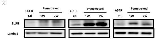 The lung adenocarcinoma cell lines CL1-0, CL1-5, and A549 were provided by Dr. Cheng-Wen Wu and Dr. Pan-Chyr Yang [,,]. Cells were grown in RPMI 1640 medium with 10% heat-inactivated fetal bovine serum and cultured at 37 °C in a humidified atmosphere with 5% CO2. The folate-deficient medium, RPMI 1640 medium without folic acid, was purchased from Gibco (Thermo Fisher Scientific, Waltham, MA, USA). Fetal bovine serum was dialyzed at 4 °C for 16 h against 10 volumes of sterile phosphate-buffered saline and used under the FD condition to minimize the amount of folate from exogenous sources. Pemetrexed from Lilly (Indianapolis, IN, USA). Gefitinib (Iressa) was obtained from AstraZeneca (Macclesfield, Cheshire, UK), and erlotinib (Tarceva) was obtained from Roche (Basel, Switzerland). Antibodies specific for E-cadherin (H-108), vimentin (V9), SLUG (A-7) (Santa Cruz Biotechnology, Dallas, TX, USA), N-cadherin (22200002) (Novus International, Saint Charles, MO, USA), Sox9 (EPR14335) (Epitomics, Wembley, London, UK), and actin (AC-15) (Sigma-Aldrich, St. Louis, MO, USA) were used in Western blot analysis.