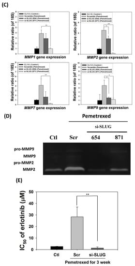 To demonstrate the correlation between invasiveness and EGFR-TKI resistance with SLUG protein induction, we performed SLUG knockdown by using the lentivirus delivery technique. As shown in Figure 5A, SLUG expression in CL1-0 knockdown cells was significantly lower than in scramble cells under the same pemetrexed-treated conditions. Moreover, SLUG silencing significantly reduced N-cadherin expression (Figure 5A). SLUG protein knockdown also resulted in fewer invaded cells than the numbers of control and scramble si-RNA groups (Figure 5B). These data correlated with MMP gene expression (MMP1, MMP2, MMP7, and MMP9) and gelatinase activity after SLUG silencing (Figure 5C,D). We also demonstrated that SLUG silencing of CL1-0 cells reduced the acquisition of resistance to erlotinib, with IC50 values dropping from 34.6 ± 0.9 (FD control) to 1.3 ± 0.5 μM (si-SLUG) (Figure 5E).