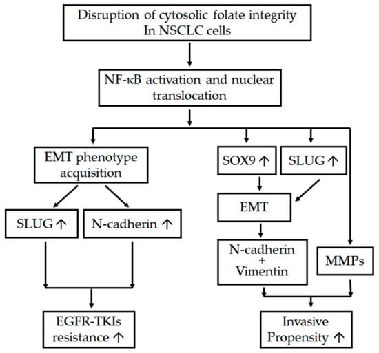 Schema of adverse effects after the disruption of folate metabolism. The diagram indicates the interaction between various mechanisms and pathways that promote the metastatic tendency and enhanced resistance of EGFR-TKIs after the disruption of folic acid metabolism in NSCLC cells. ↑ denotes upregulation.
