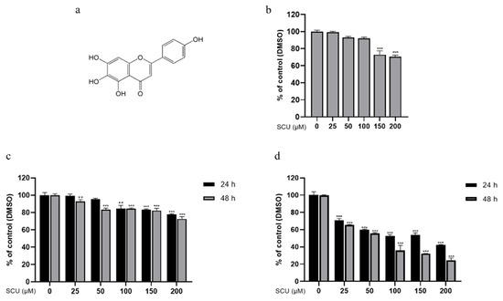 The chemical structure of scutellarein (SCU) and the effect of SCU treatment in HCC cell lines and HaCaT cells. (a) Structure of SCU. (b) Cell viability was measured by 3-(4,5-dimethylthiazol-2-yl)-2,5-diphenyltetrazolium bromide (MTT) assay with SCU (0, 25, 50, 100, 150, and 200 μM) for 48 h in HaCaT cells. (c) Cell viability was measured by MTT assay with SCU (0, 25, 50, 100, 150, and 200 μM) for 24 and 48 h in HepG2 cells. (d) Cell viability was measured by MTT assay with SCU (0, 25, 50, 100, 150, and 200 μM) for 24 and 48 h in Huh-7 cells. The results obtained from three independent experiments were expressed as mean ± standard deviation (SD) compared with the control group. ** p < 0.01, *** p < 0.001.