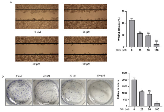 To confirm the inhibitory effects of SCU, cells were treated with the indicated concentrations of (0, 25, 50, and 100) μM for 48 h. Inhibition of cell migration was confirmed by wound healing assay. Figure 2a shows that SCU significantly inhibited the cell migration of marginal cells in a concentration-dependent manner. Similarly, the results of cell proliferation were measured by colony formation assay, which showed that SCU significantly decreased the number of colonies in a concentration-dependent manner (Figure 2b).