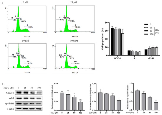 Effect of SCU on cell cycle progression in HepG2 cells. (a) SCU induces HepG2 cell G2/M cell cycle arrest. Cells were treated with SCU (0, 25, 50, and 100 μM) for 48 h and the cell cycle was detected by flow cytometry. (b) Cdc25c, cdk1, and cyclin B1 levels were quantified. The results obtained from three independent experiments were expressed as mean ± standard deviation (SD) compared with the control group. * p < 0.05, ** p < 0.01, *** p < 0.001.