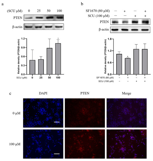 Effect of SCU on PTEN expression in HepG2 cells. (a) SCU induces PTEN protein level in HepG2 cells. Cells were treated with SCU (0, 25, 50, and 100 μM) for 48 h. (b) Effect of PTEN inhibitor and SCU-induced PTEN level in HepG2 cells. Cells were treated with or without 80 μM of PTEN inhibitor: SF1670 and 100 μM of SCU for 48 h. (c) Representative immunofluorescence image images of expression of PTEN were evaluated at 0 and 100 μM (scale bars = 100 μm). The results obtained from three independent experiments were expressed as mean ± standard deviation (SD) compared with the control group. * p < 0.05.
