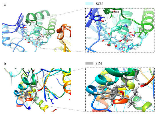To determine whether the induction of PTEN was associated with the treatment of SCU and PTEN, the protein level was analyzed by immunoblotting. The cells were treated with SCU at the indicated concentrations of (0, 25, 50, and 100) μM for 48 h. Figure 4a shows that SCU-treated cells significantly increased the expression of PTEN. Several proteins have been involved in the negative regulation of PI3K activation [24]. Among these, PTEN is the most crucial negative regulator of the PI3K signaling pathway [25]. Therefore, to confirm the activation of PTEN by SCU in HepG2 cells, we performed an inhibitor assay. The cells were treated with or without 80 μM of PTEN inhibitor SF1670 and 100 μM of SCU for 48 h. The results revealed that SCU significantly upregulated the protein expression of PTEN, and the activity of SCU was higher than that of the PTEN inhibitor (Figure 4b). Consistently, immunofluorescence assay also demonstrated the markedly increased expression of PTEN due to SCU treatment (Figure 4c). To support the interaction of PTEN with SCU, we performed in silico molecular docking, and compared the binding affinity of the complex to a reference PTEN activator simvastatin (SIM). The protein structure of PTEN with the ligands SCU and SIM was subjected to ligand protein docking using UCSF Chimera software (https://www.cgl.ucsf.edu/chimera/, accessed on 10 August 2021). Figure 5a,b represent the results, which show the bound complex of SCU and SIM with PTEN. The molecular dock score revealed the binding affinity with an estimated free energy of −6.5 kcal/mol by SIM, followed by comparably higher free energy of −8.4 kcal/mol by SCU. In addition, the interacting amino acid residues involved in the bound complex of PTEN with SCU were found to be TYR16, THR160, ASP92, HIS93, ARG130, LYS128, GLN171, and ILE168. Whereas the PTEN with SIM complex includes ILE28, CYS136, PHE154, GLU150, and VAL158. The obtained results of docking suggest that SCU shows a higher binding affinity with PTEN, compared to the reference activator SIM. Overall, our findings indicate that SCU as a PTEN activator and may be useful in treatment option in HCC.