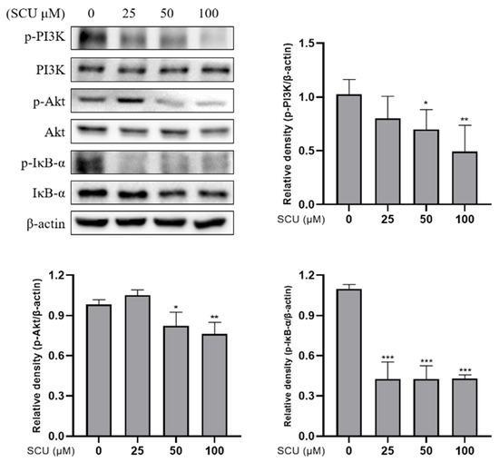 Effect of SCU on PI3K/Akt/NF-κB signaling pathway in HepG2 cells. SCU suppresses p-PI3K, p-Akt, and p-IκB-α levels in HepG2 cells. Cells were treated with SCU (0, 25, 50, and 100 μM) for 48 h. The results obtained from three independent experiments were expressed as mean ± standard deviation (SD) compared with the control group. * p < 0.05, ** p < 0.01, *** p < 0.001.