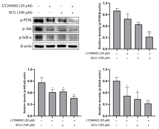 Inhibitory effect on PI3K/Akt/NF-κB signaling pathway in HepG2 cells. Effect of PI3K inhibitor and SCU-induced inhibition of p-PI3K, p-Akt, and p-IκB-α levels in HepG2 cells. Cells were treated with or without 20 μM of PI3K inhibitor: LY294002 and 100 μM of SCU for 48 h. The results obtained from three independent experiments were expressed as mean ± standard deviation (SD) compared with the control group. * p < 0.05, ** p < 0.01, *** p < 0.001.