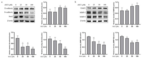 To verify the migration and invasion inhibitory effect of SCU, we performed experiments to investigate the epithelial-to-mesenchymal transition (EMT) markers and migration-related proteins. We assessed the expression levels of EMT-related proteins (E-cadherin, N-cadherin, and Snail) and migration-related proteins (TIMP2, MMP-2, and MMP-9) by immunoblotting. The cells were treated with SCU at the indicated concentrations of (0, 25, 50, and 100) μM for 48 h. Figure 8a shows that SCU upregulated the expression of E-cadherin, whereas N-cadherin and Snail were downregulated, respectively. Moreover, SCU induced the extracellular inhibitor of MMPs: TIMP2, but downregulated MMP-2 and MMP-9 in a dose-dependent manner (Figure 8b). These findings indicate that SCU inhibits HepG2 cell metastasis through the regulation of EMT markers and migration-related proteins.