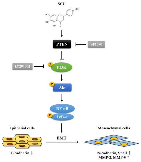 In certain cancers, and as a result of chemotherapy, the transcription factor NF-κB is activated. In the transcriptional activation of genes linked with proliferation, the central role of NF-κB tends to be metastasis to promote oncogenesis and cancer therapy resistance. Nevertheless, the existing data are sufficiently promising to consider careful research to dissect the role of NF-κB in a number of cancers, and to assess the applicability of NF-κB inhibition as an adjuvant strategy in conventional cancer therapy approaches [40]. Collectively, our findings suggest that SCU upregulates PTEN, and consequently downregulates PI3K/Akt and IκB-α expression. Inhibitor assay with PTEN inhibitor SF1670 supports the suggestion that SCU is a PTEN activator. To the best of our knowledge, PTEN activation in SCU treated HepG2 cells plays a significant role. In addition, we used LY294002, a specific inhibitor of PI3K, to confirm whether SCU treatment could inhibit the PI3K signaling pathways, similar to LY294002. LY294002 is a synthetic PI3K inhibitor based on quercetin, a flavonoid found in nature that inhibits a wide range of protein kinases [41]. Treatment with SCU significantly downregulated the expression of PI3K and its downstream proteins.