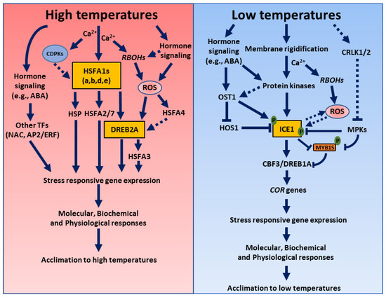 A schematic model showing coordination between various signaling components to induce acclimation responses to temperatures stress. The interplay between the ROS; hormones; and other signaling components such as Ca2+, CDPKs, MAPKs, and TFs determines the plant’s molecular, biochemical, metabolic and physiological responses to high or low temperatures. Left panel: Heat stress affects the membrane fluidity and simultaneously triggers hormone signaling pathways, resulting in increased cytosolic calcium, reactive oxygen species, and the activation of other cytoplasmic proteins. The intercellular calcium activates CDPKs or RBOHs, which result in ROS production. Hormones and ROS, along with other signaling components, interdependently activate multiple signaling pathways to alter the activity of the heat shock factors (e.g., HSFA1), which, in turn, activate other transcription factors like Dehydration-Responsive Element-Binding Protein2a (DREB2A), inducing the appropriate stress-responsive gene expression. Right panel: Low temperatures trigger plasma membrane rigidification, and activate the Ca2+ channels, leading to increased Ca2+ concentrations in the cytosol. The cytosolic calcium activates protein kinases such as CDPKs that, in turn, phosphorylate the transcription factor ICEAlternatively, ICE1 can be phosphorylated by ABA-induced OSTICE1 activates the expression of the CBF genes by directly binding to their promoters at low temperatures, inducing the appropriate COR gene expression. Some of the common features between high- and low-temperature response pathways include changes in the membrane fluidity, alterations in the levels of plant hormones, the production and accumulation of ROS, calcium, NO and MAPK signaling, protein sumoylation and proteasomal degradation, the reprogramming of transcriptomic or metabolomic signatures, and other stress-responsive signaling cascades. Distinct signaling components in high- and low-temperature response pathways include TFs, proteins, stress-responsive genes, the formation and accumulation of secondary metabolites, sugars, amino acids, etc. ABA, abscisic acid; AP2/ERF, Apetala2/Ethylene Responsive Factor; Ca2+, calcium; CBF, C-repeat-binding factor; CDPK, calcium-dependent protein kinase; COR, cold-response genes; CRLK, calcium/calmodulin-regulated receptor-like kinases; DREBs, dehydration response element-binding factors; HOS1, HIGH EXPRESSION OF OSMOTICALLY RESPONSIVE GENE1; HSP, heat shock proteins; HSF, HEAT SHOCK FACTOR; ICE1, inducer of CBF expression 1; MPKs, mitogen-activated protein kinase; MYB, Myb-like transcription factors; NAC, NAM, ATAF, and CUC family TF; OST1, OPEN STOMATA 1; RBOHs, respiratory burst oxidase homologs; ROS, reactive oxygen species; and SnRK2, SNF1-related protein kinase 2.