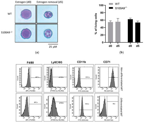First of all, we determined whether S100A9−/− ER-Hoxb8 cells could constitute a relevant tool to study the role of S100A8/A9 in pro-inflammatory functions of primary neutrophils since these cells cannot be genetically modified and therefore no functional experiments can be performed after knock out of a protein of interest. To achieve this aim, we controlled whether S100A9−/− cells were able to differentiate into neutrophils upon five days of estrogen starvation similarly to WT Hoxb8 cells. After 5 days of differentiation, WT and S100A9−/− Hoxb8 cells presented the typical polymorphic nucleus of neutrophils compared to their respective progenitors (Figure 1a) while the viability of differentiated WT and S100A9−/− Hoxb8 cells was not affected throughout the differentiation process (Figure 1b). To evaluate the state of differentiation of Hoxb8 cells into neutrophils, progenitor and granulocytic marker expression was measured by flow cytometry. As expected, a down-regulation of the progenitor marker CD71 was observed upon differentiation while CD11b and Ly6C/6G were up-regulated in WT Hoxb8 cells. The expression level of F4/80 remained unchanged before and after differentiation (Figure 1c).