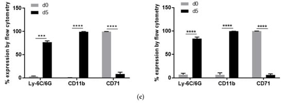 Besides the absence of certain types of granules, differentiated Hoxb8 cells also have other limitations. Indeed, the process leading to the differentiation of Hoxb8 cells still needs to be improved. However, the rate of differentiation of Hoxb8 cells, obtained from our experimental conditions, was in line with those previously reported [,,]. Saul et al. [] have even recently succeeded reaching a rate of differentiation of approximately 90% by adding IFN-γ and TNF-α during the differentiation process. However, a further improvement of the percentage of differentiation and exclusion of contaminating cells (e.g., monocytes) are still required to reach a rate of ≥99% of neutrophils.