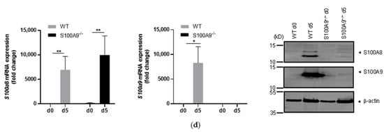 - Hobbs, J.A.; May, R.; Tanousis, K.; McNeill, E.; Mathies, M.; Gebhardt, C.; Henderson, R.; Robinson, M.J.; Hogg, N. Myeloid cell function in MRP-14 (S100A9) null mice. Mol. Cell Biol. 2003, 23, 2564–2576. [Google Scholar] [CrossRef]