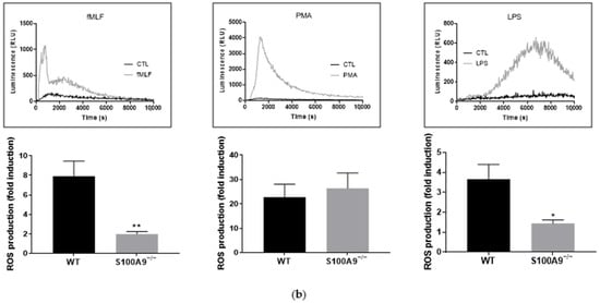 As previously described in neutrophil-like differentiated HL-60 cells [], ROS production was decreased in S100A9−/− Hoxb8 cells in response to fMLF. In contrast, PMA-induced ROS production was not impaired by the absence of S100A9 (Figure 2b) confirming that S100A9−/− cells have a functional NADPH oxidase system. Finally, the absence of S100A8/A9 led to a reduced ROS production after LPS stimulation of S100A9−/− Hoxb8 cells when compared to WT Hoxb8 cells (Figure 2b). To our knowledge, this is the first report on the involvement of S100A8/A9 in LPS-mediated regulation of NADPH oxidase activation.