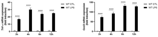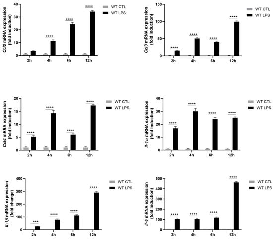 Expression of cytokines in WT differentiated Hoxb8 cells stimulated with LPS. Hoxb8 neutrophils were stimulated for 2, 4, 6 and 12 h without or with 100 ng/mL of LPS. The expression of Ccl2, Ccl3, Ccl4, Il-1α, Il-1β, Il-6, Tnf-α and Cxcl2 mRNAs was assessed by qPCR. Data normalization was performed using three reference genes (Actβ, B2m and Gusb) and expressed as fold induction compared to non-stimulated control. Results are presented as mean ± SEM of three independent experiments. *** = p < 0.001; **** = p < 0.0001.